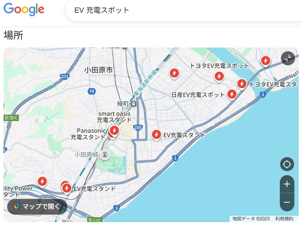 Googleで「EV 充電スポット」と検索すれば、地図が表示されます。