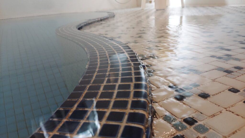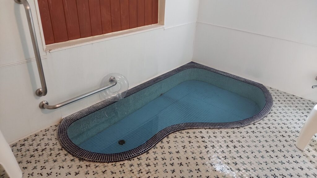 案内された浴室には、大人3名分サイズのタイル敷きの浴槽が備わっていました。