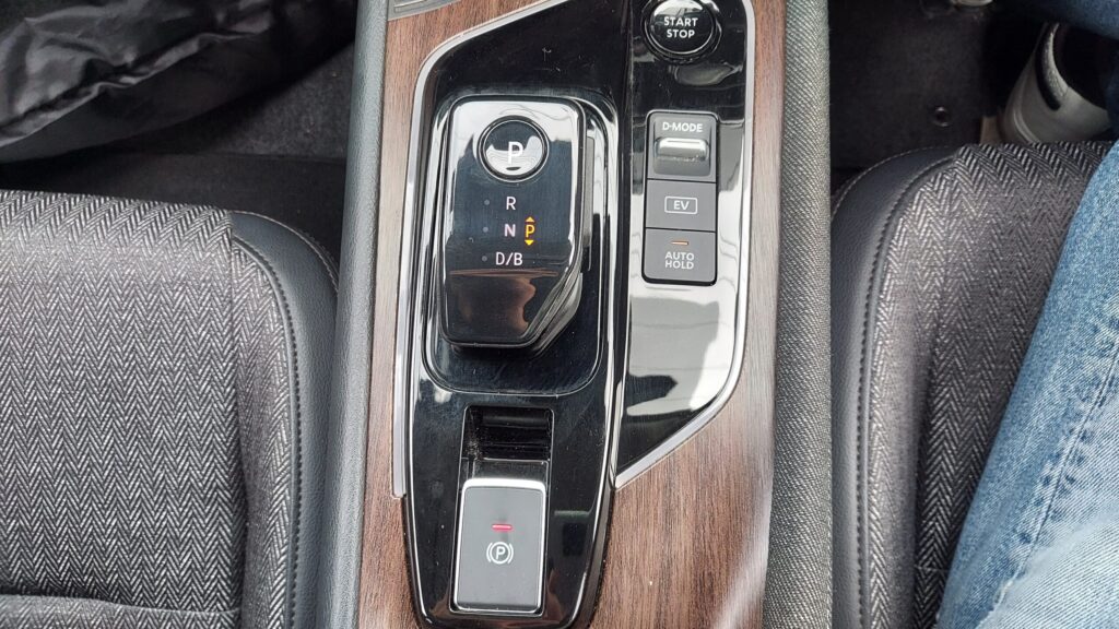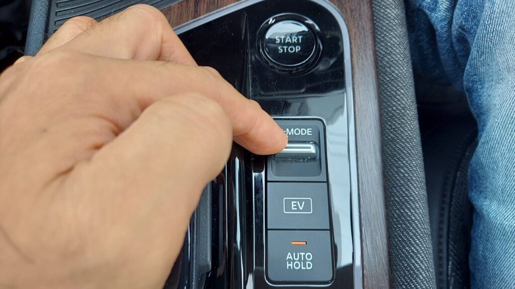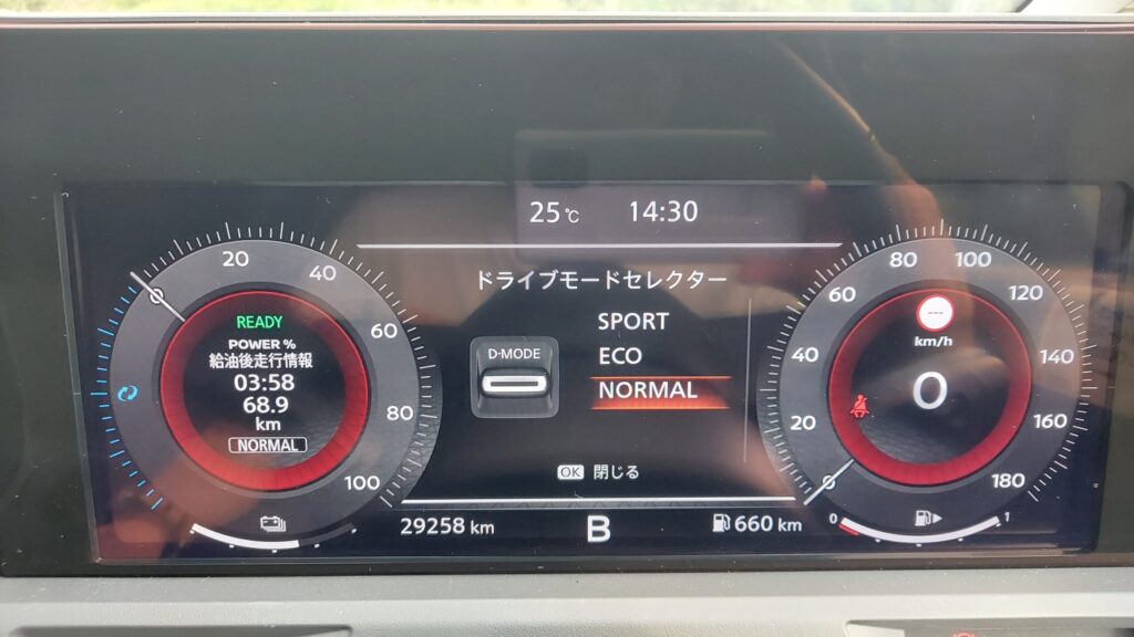 次に、「ドライブモード」の選択ですが、シフトノブの横の「D-MODE」スイッチを上下にすることで、メーター画面上で変えることができます。