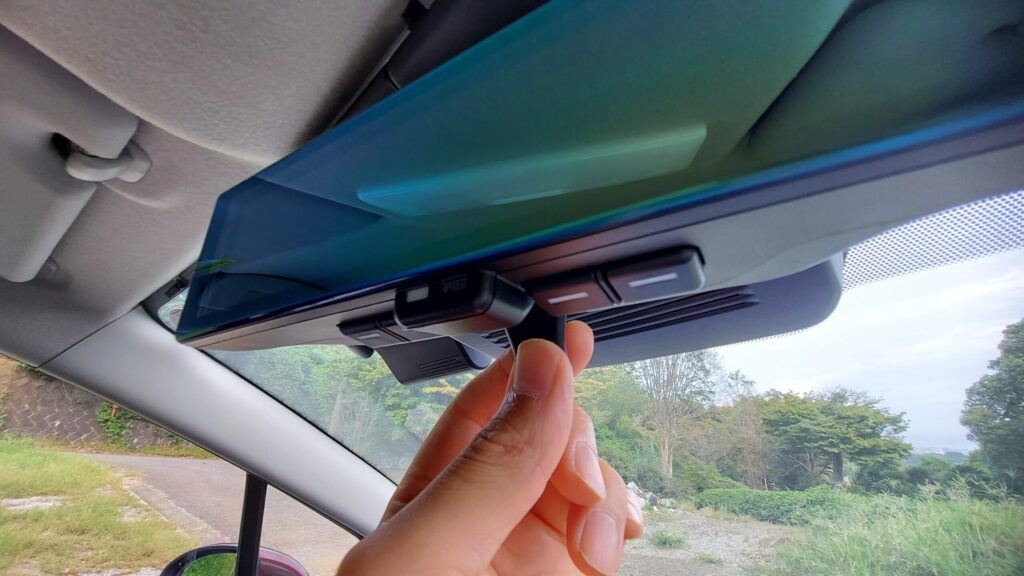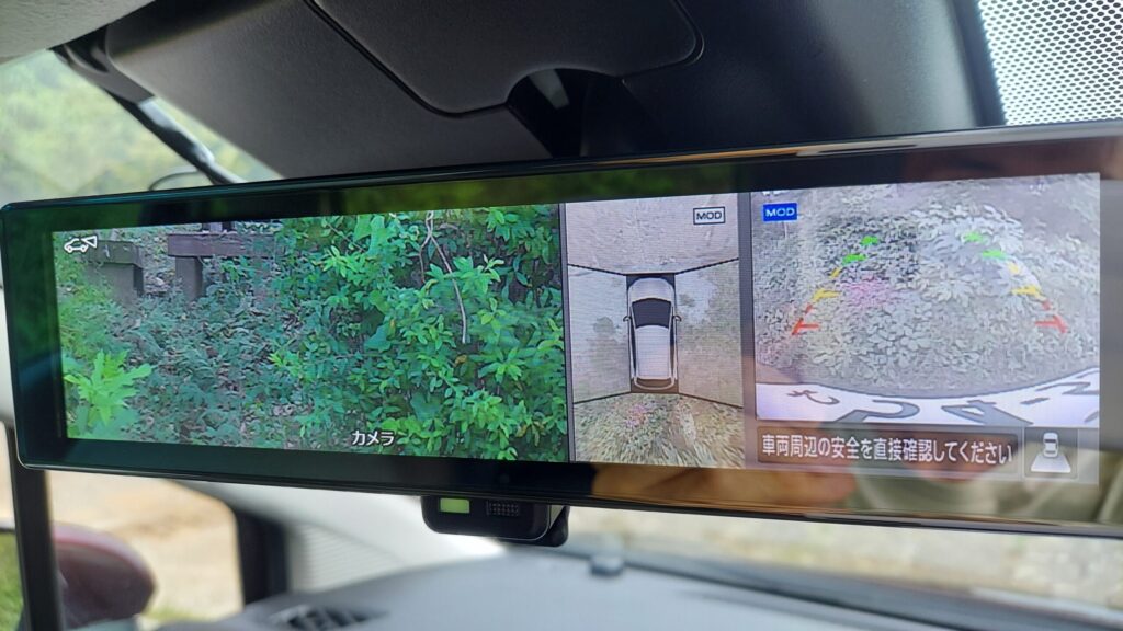 ルームミラーは、下側のレバーにより、後部のカメラ映像と、通常のミラーの切り替えができます。