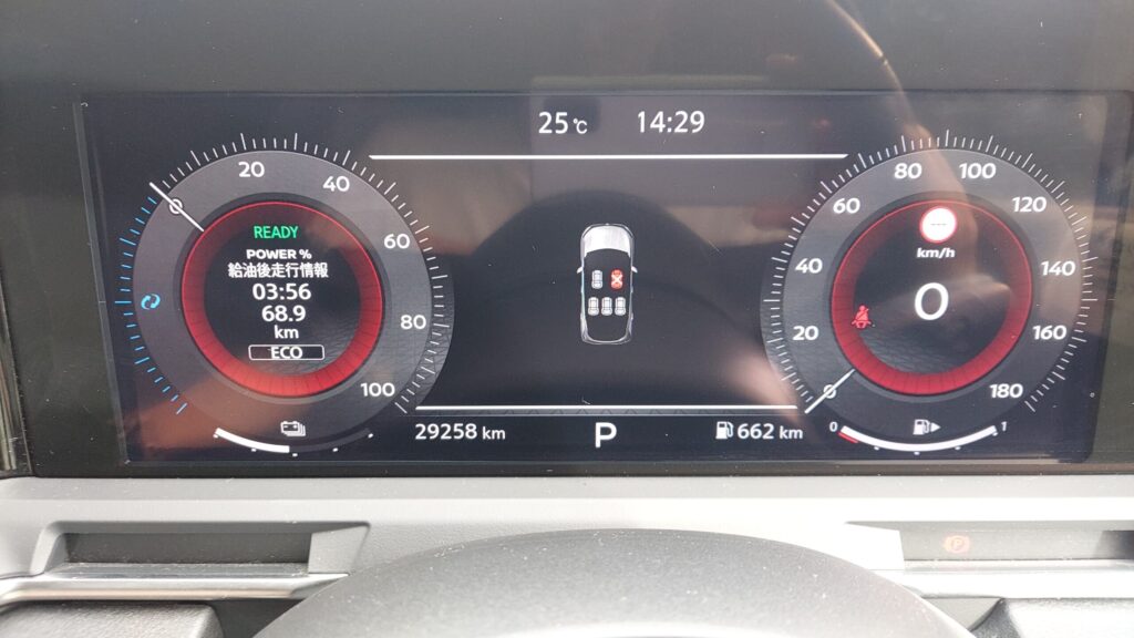 そのため、箱根の「国道1号線」の山道下り坂では、「ECO」モードで、フットブレーキをほぼ使わず走れましたよ。
