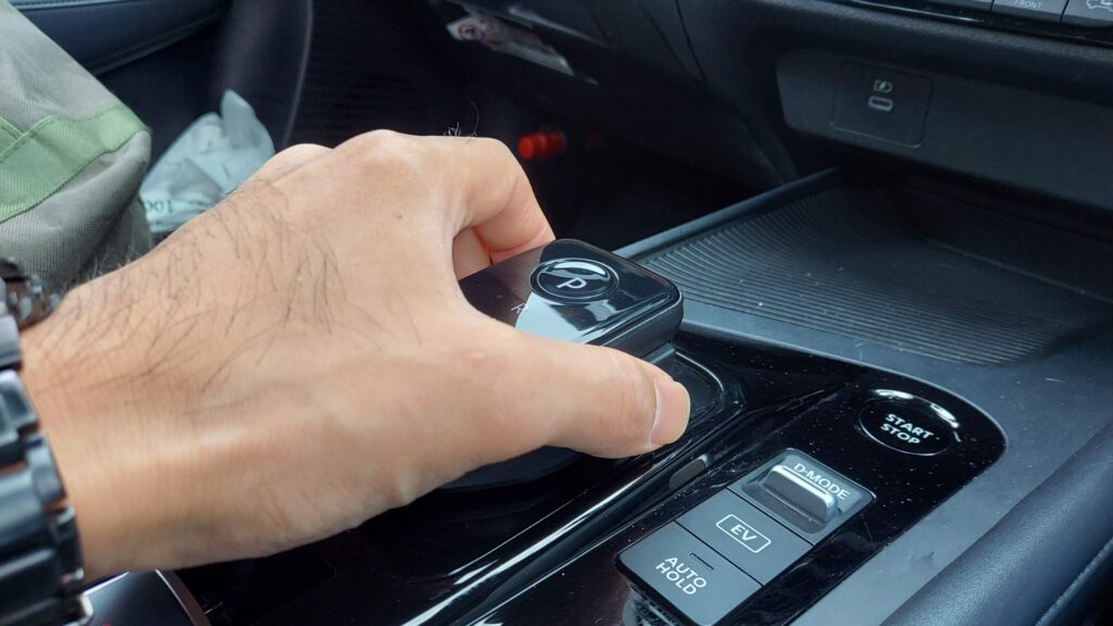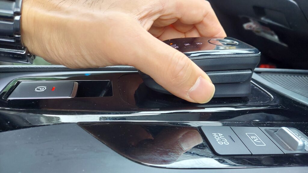 バックの「R」レンジに入れるときは、横のボタンを押しながら、2回上に「コツ、コツ」っとスライドさせます。