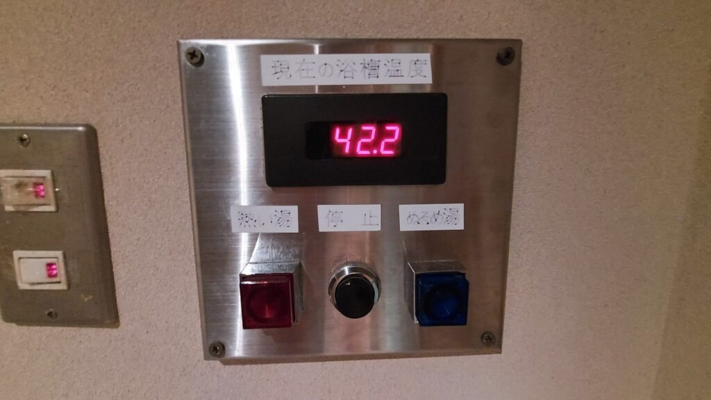 温度は42℃位ですが、脱衣場のボタンでお湯を追加し、好みの湯かげんにすることができます。