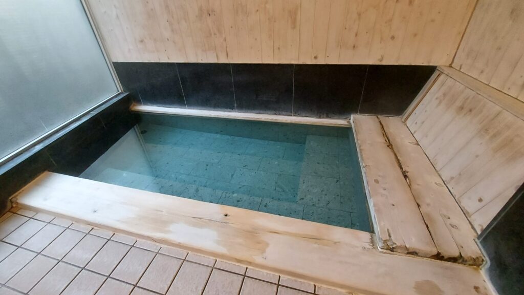 浴槽は、大人3人分程のサイズで、横のヒノキ板にもたれかかかれるようになっています。
